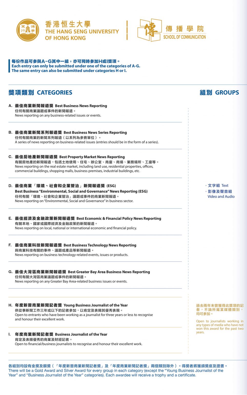 The 10th Business Journalism Awards of HSUHK – Awards Categories/Groups